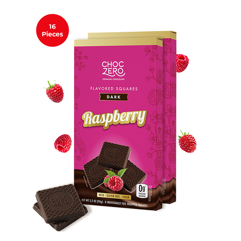 Each box contains 8 individually wrapped pieces of dark chocolate raspberry squares.